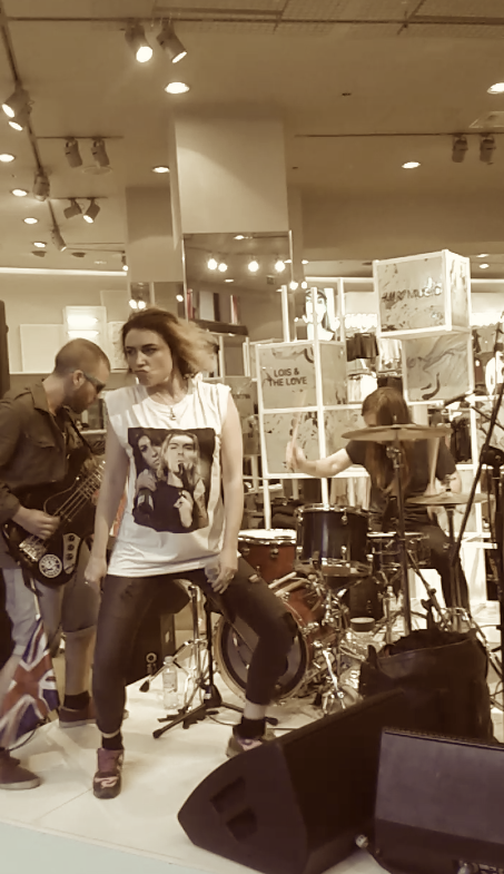 A sharp noise suddenly invades the building. My slow brain thinks it is a Fire Alarm. I look around. Oh. It is a band called Lois & the Love sound checking in the middle of H&M. I never liked shopping anyway, a good excuse to run away from the dresses and stand in front of the band, where a few curious people have gathered.